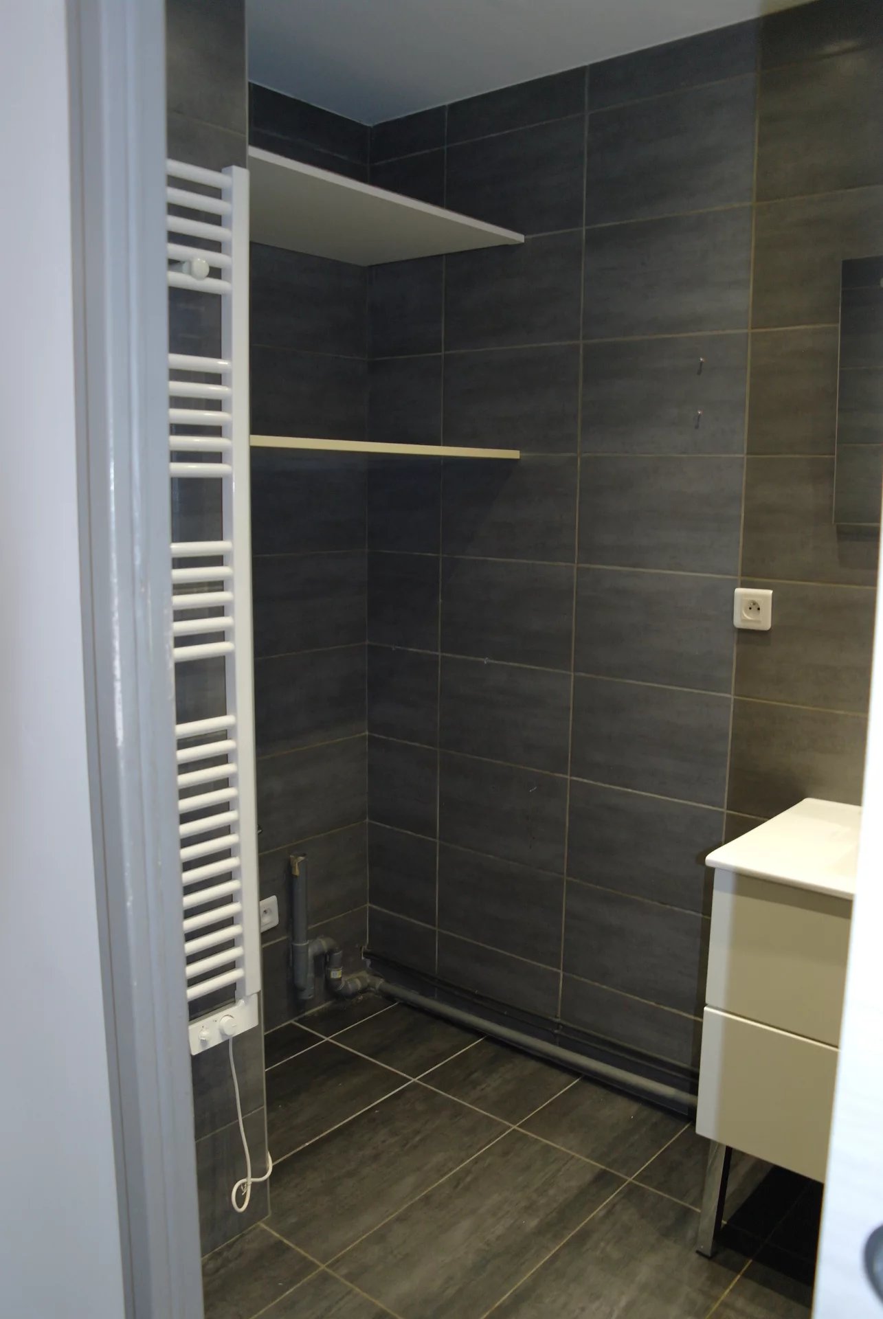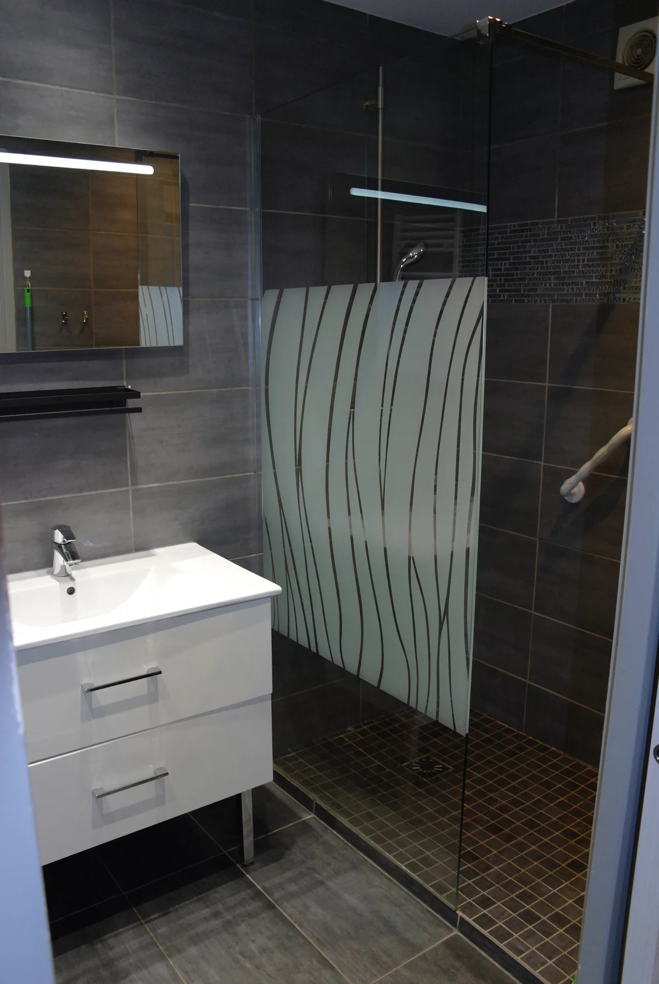 Salle d’eau avec meuble vasque, vasque, miroir, douche italienne, sèche serviette électrique, emplacement lave-linge et étagère de rangements. WC Séparé.